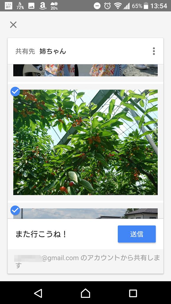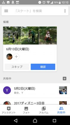 共有タブにアクセスすると、「共有の候補」が表示されるようになっていることに気がつくはずです。タップすると自動的に抽出された共有相手と写真が表示されるので、タイトルやメッセージを添えて送信すれば、ものの数秒で共有が完了します。