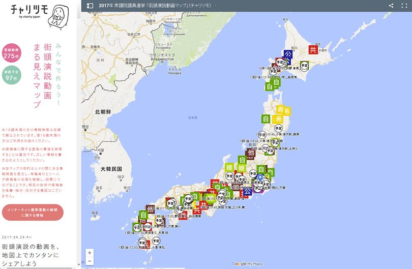 一般社団法人チャリティジャパンが、「2017年 衆議院議員選挙 街頭演説動画 まる見えマップ」というウェブサービスを提供しています。